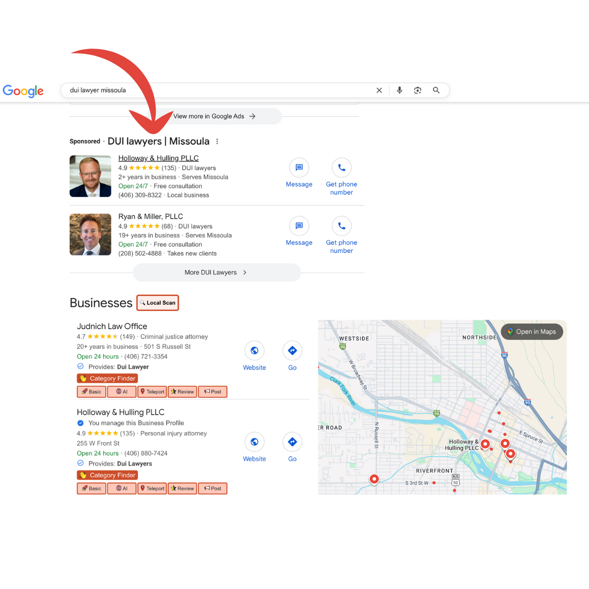 Local Services Ads (LSAs) are Google’s pay-per-lead placements for vetted “Google Screened” law firms, showing above regular ads with a phone-first call button. Because you pay only for valid leads—not every click—LSAs typically drive more qualified, ready-to-talk callers at a lower acquisition cost than traditional PPC.
