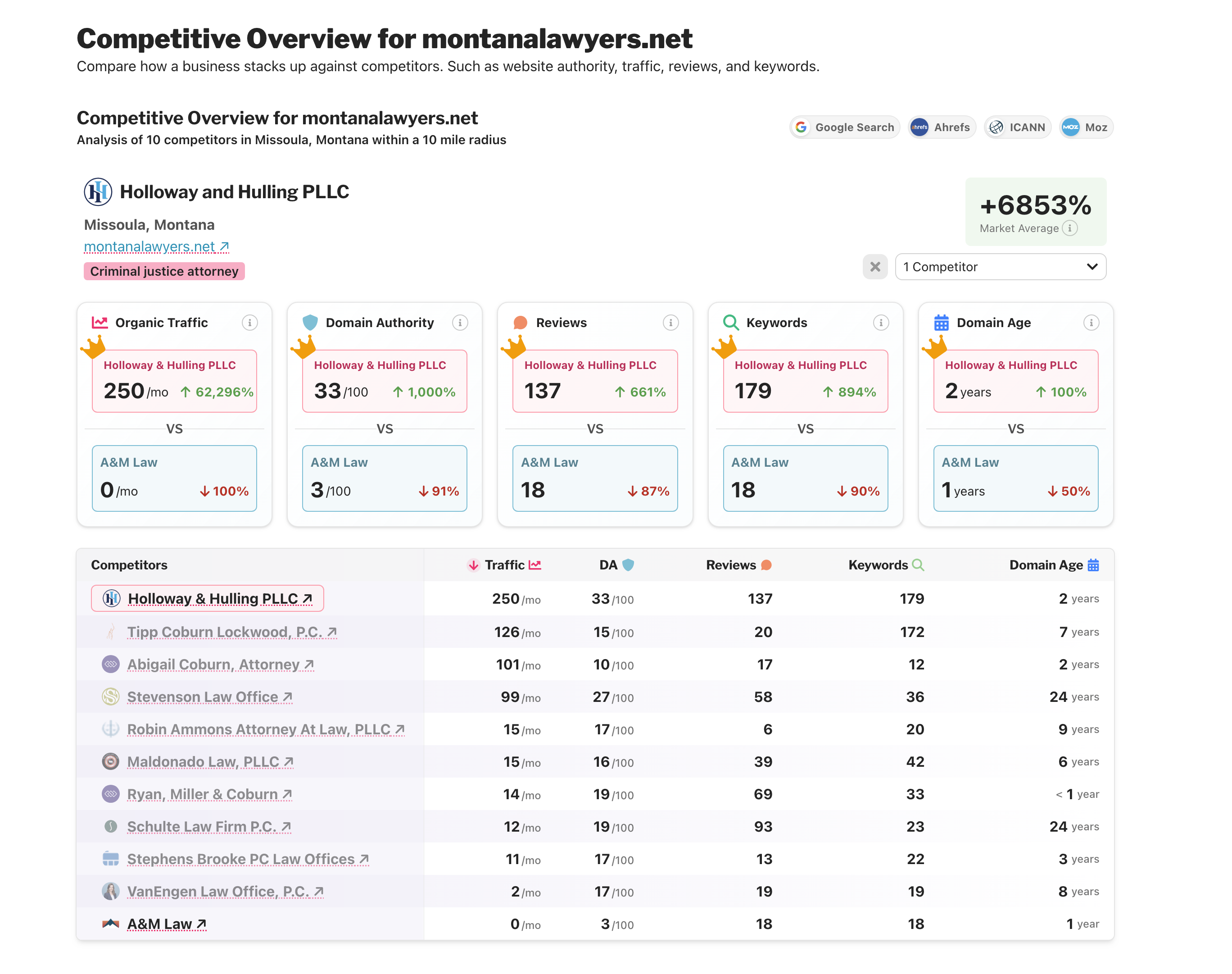 Competitor stack: organic traffic, reviews, keywords, domain authority, domain age